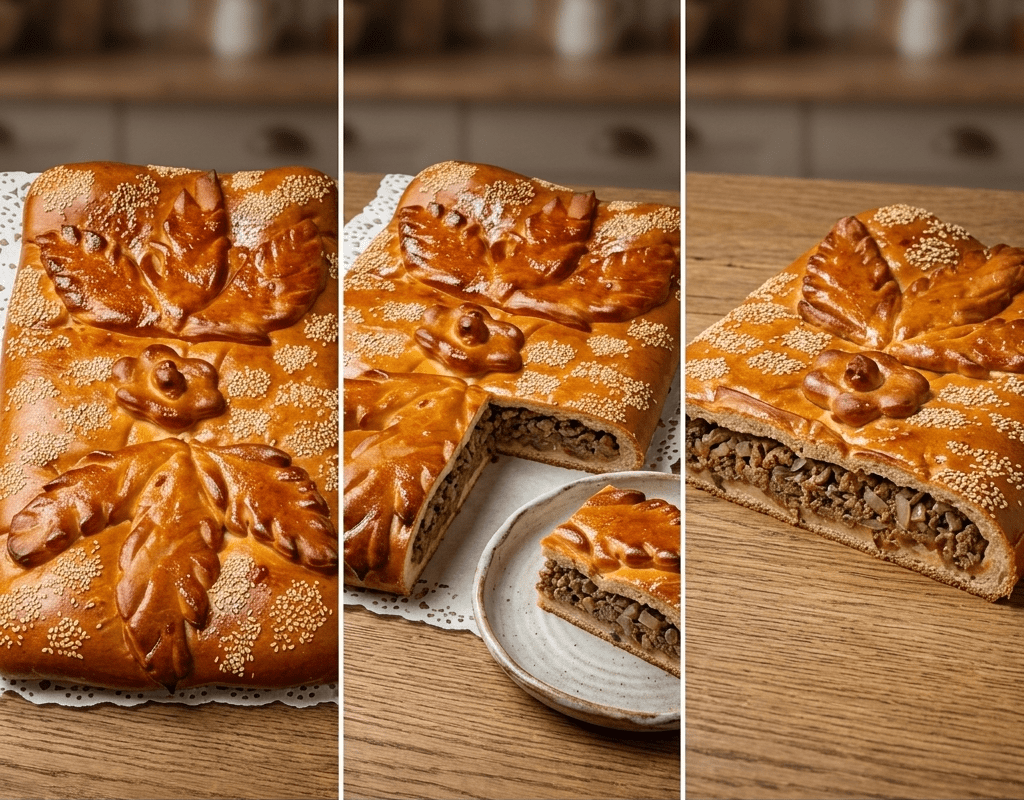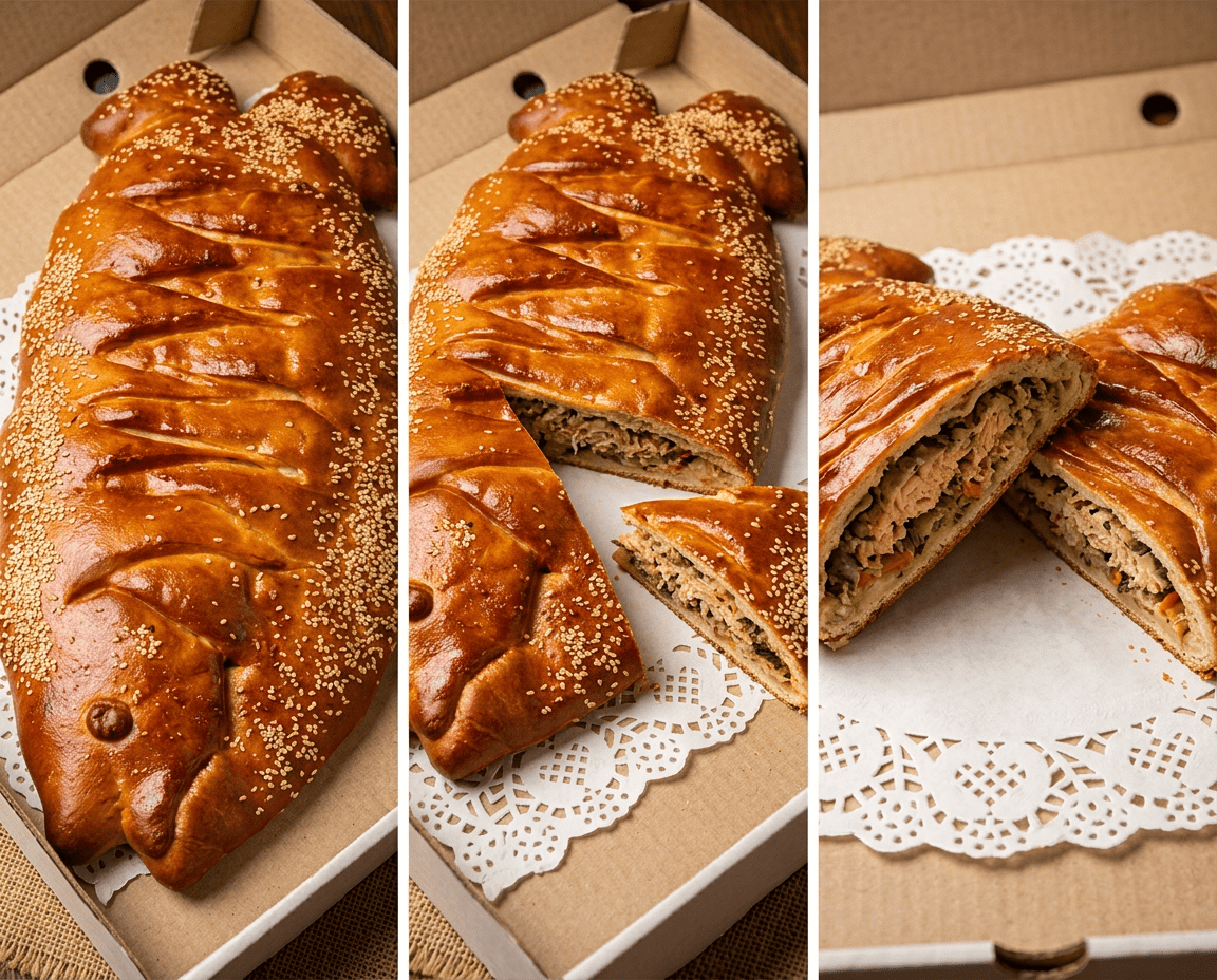 Начинка: Рыбное филе минтая (возможно любая другая рыба), лук, соль, перец, морковь.